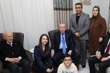 Cumhurbaşkanı Recep Tayyip Erdoğan, 6 Şubat depremlerinin yıl dönümünde düzenlenen toplu açılış töreninin ardından, MHP Lideri Devlet Bahçeli ve TBMM Başkanı Numan Kurtulmuş ile birlikte depremzede So...